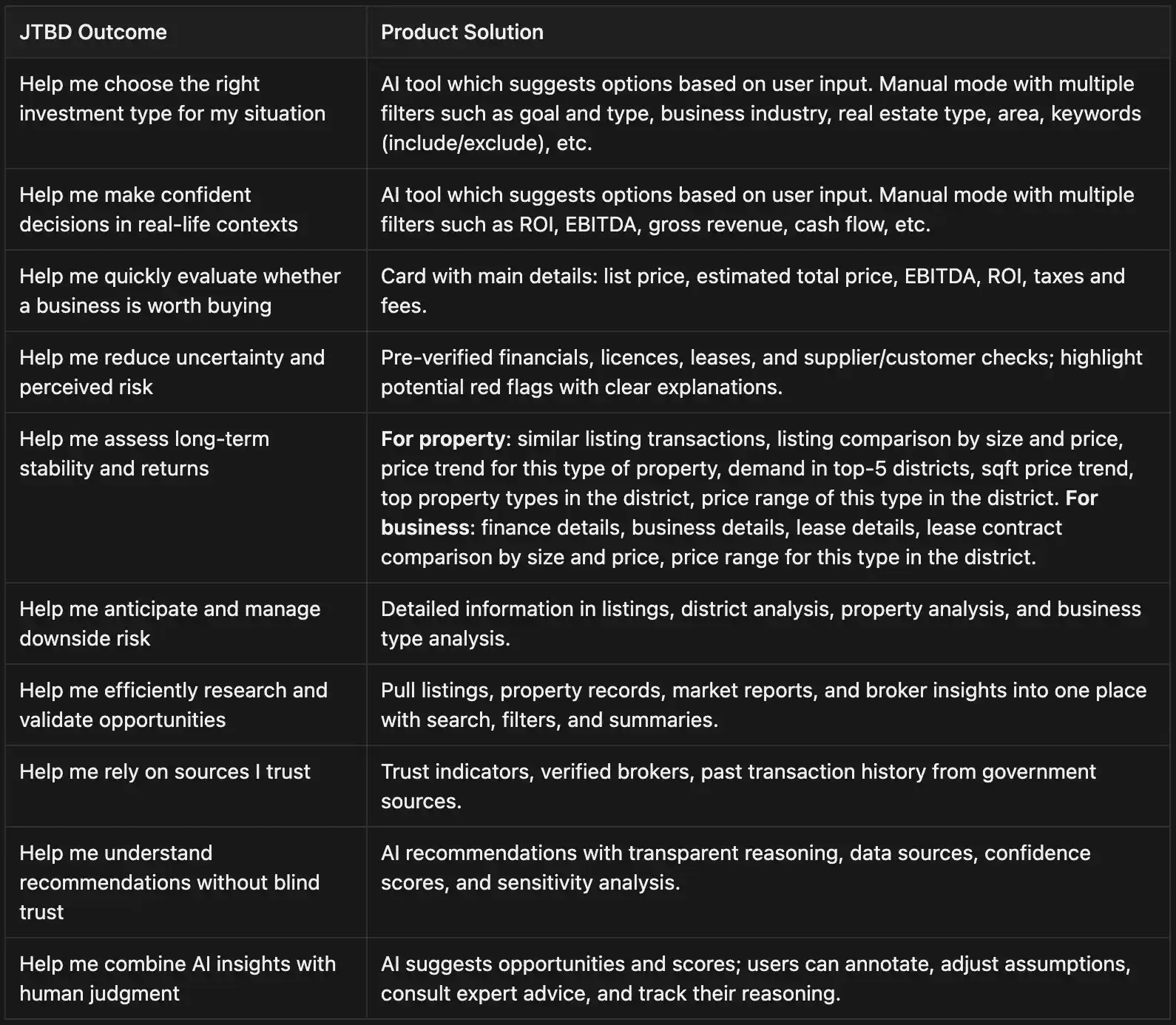 Each interview uncovered a practical need – a “job” investors were trying to get done. I defined and structured these into clear Jobs‑to‑Be‑Done, capturing goals like evaluating opportunities faster, reducing uncertainty, and choosing between options with confidence.