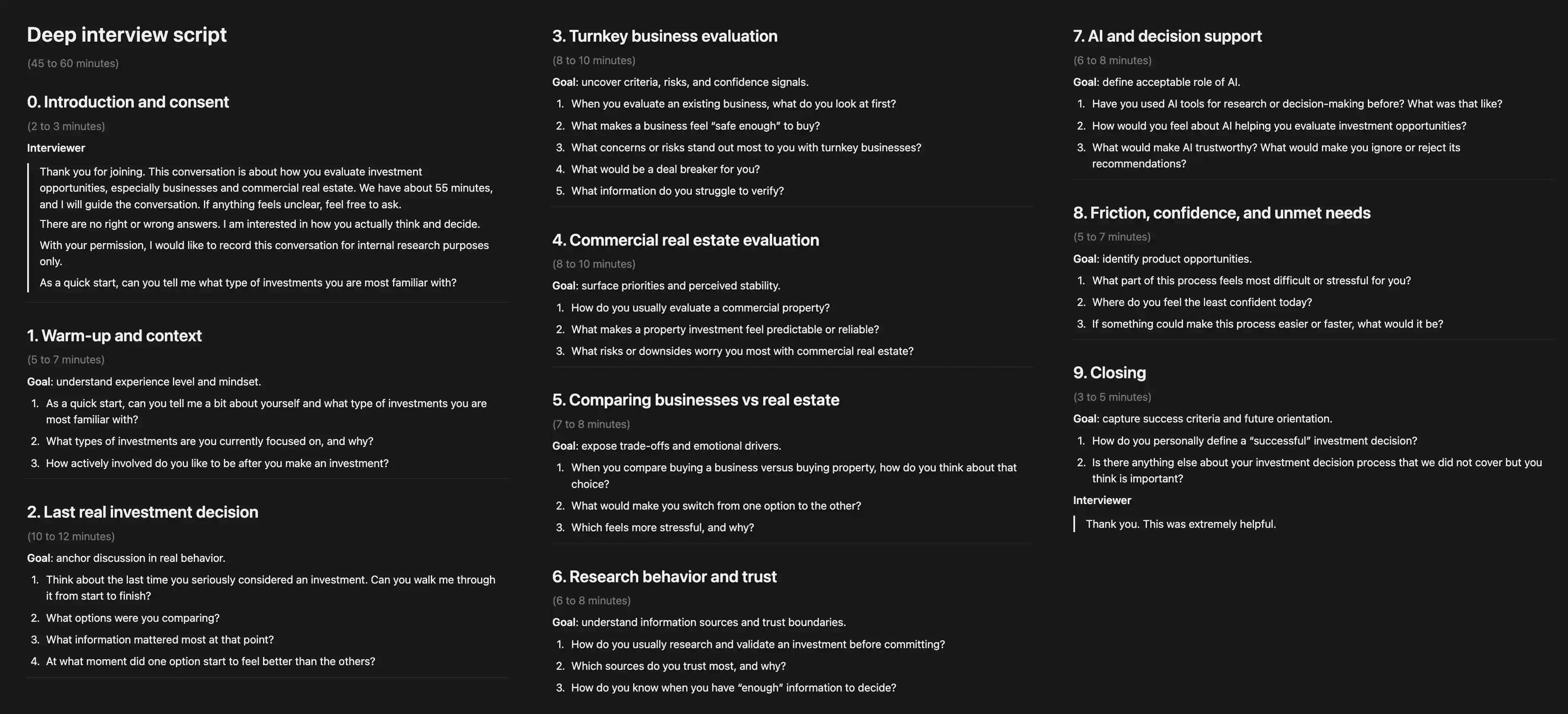 Numbers only show part of the story, so I followed up with 7 in‑depth interviews – 4 experienced investors and 3 new to the field. That’s where the real nuance surfaced. One investor admitted it’s tough “to compare a coffee shop with a warehouse – both can be profitable, but how do you know which fits you?” Another said, “I don’t need more listings, I need help figuring out which option won’t waste my time.”