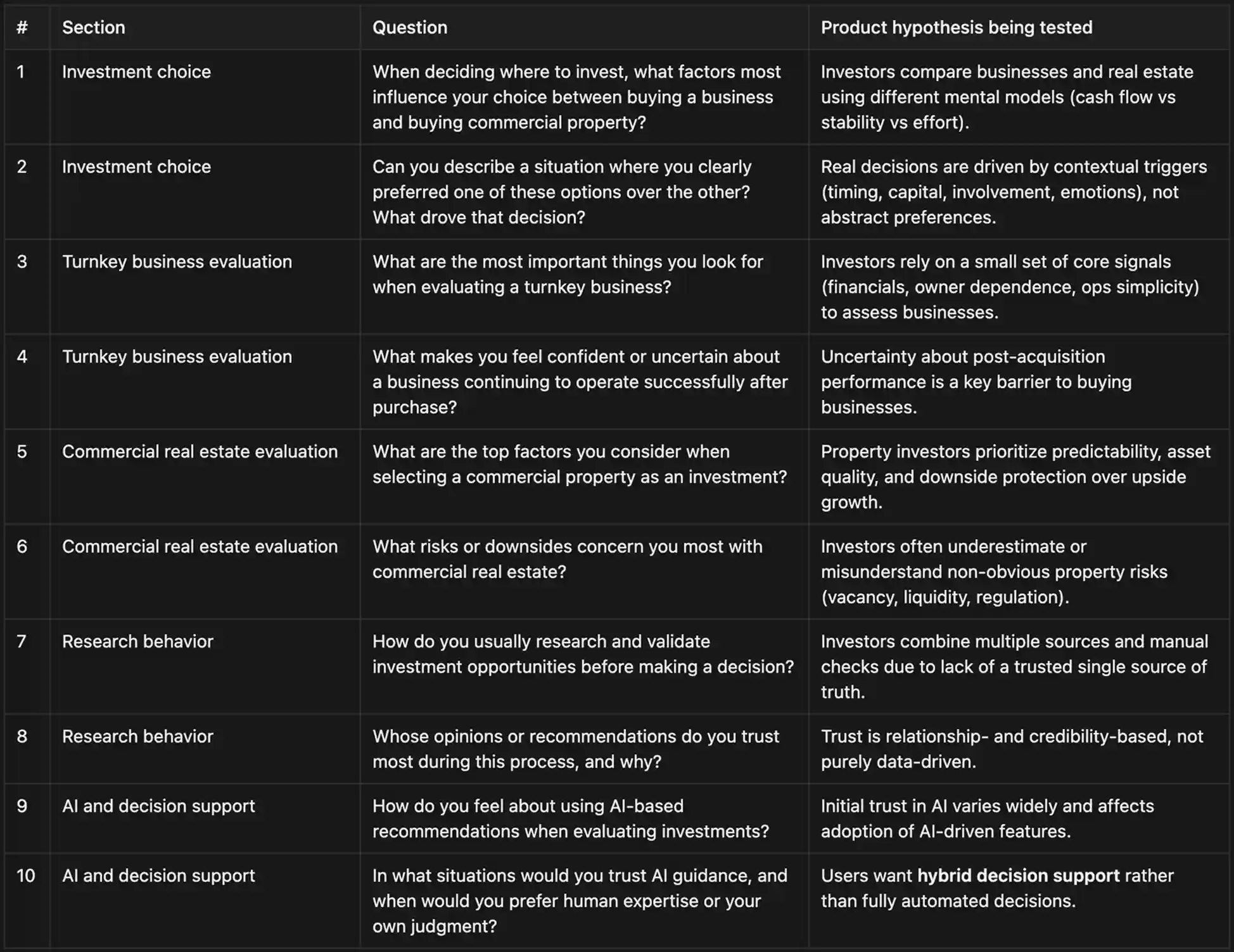 After mapping the competitive landscape, I distilled my findings into ten product hypotheses across five key themes, from how people choose investments to how much they trust AI recommendations. These became the starting point for validating assumptions with real users. To test them, I ran an online survey with 41 participants – investors at different stages of experience. 23 had prior investment backgrounds in real estate or turnkey businesses, while 18 were still exploring their first opportunities. Their responses revealed emerging patterns: how investors prioritize confidence over speed, what increases hesitation, and when uncertainty begins to creep in.