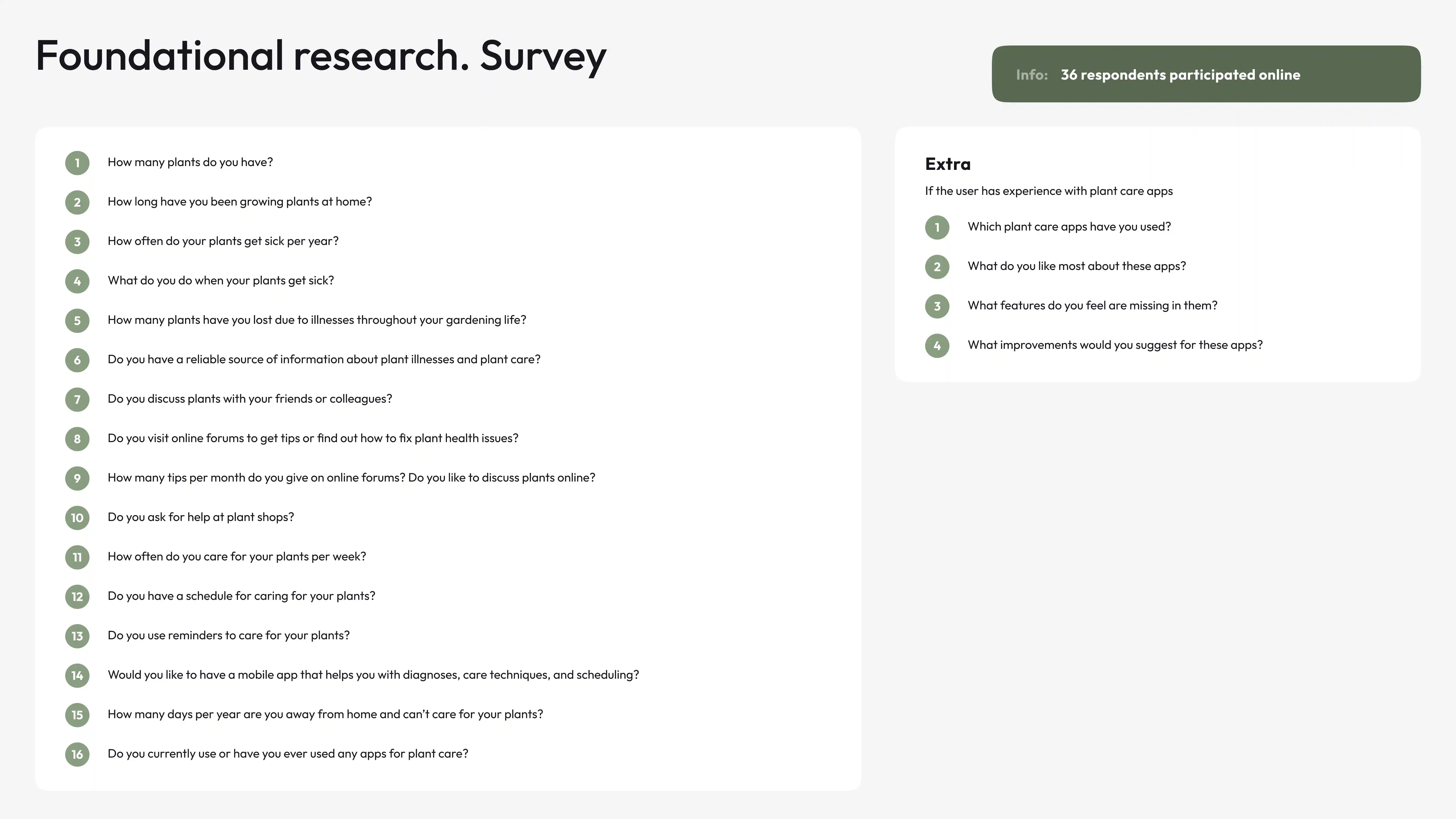 It included 16 core questions about their routines and motivations, plus 4 additional questions for those who had already tried plant‑care apps.